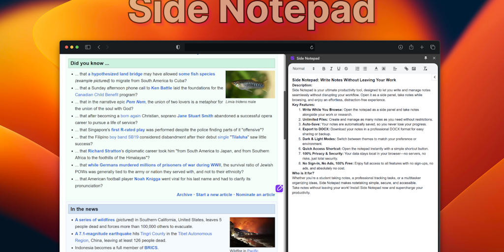 Side Notepad: Write Notes Without Leaving Your Work. Write and manage notes in a side panel while working or browsing. Features include unlimited notes, auto-save, DOCX export, dark/light modes, 100%