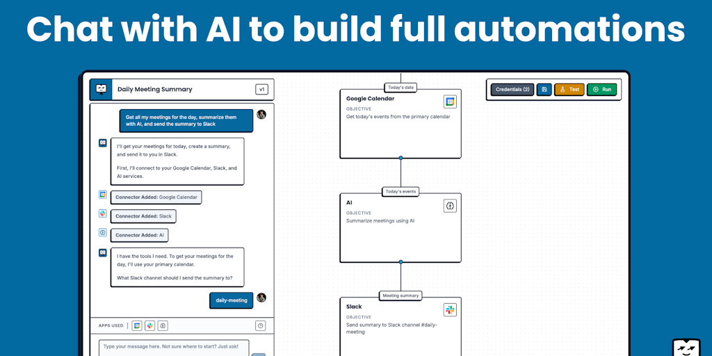 Describe your workflow in chat and watch Sidekick build it. AI adds connectors, configures logic, and handles errors. Run it on demand or on a schedule. Connect Gmail, Calendar, Docs, Notion, Slack, a