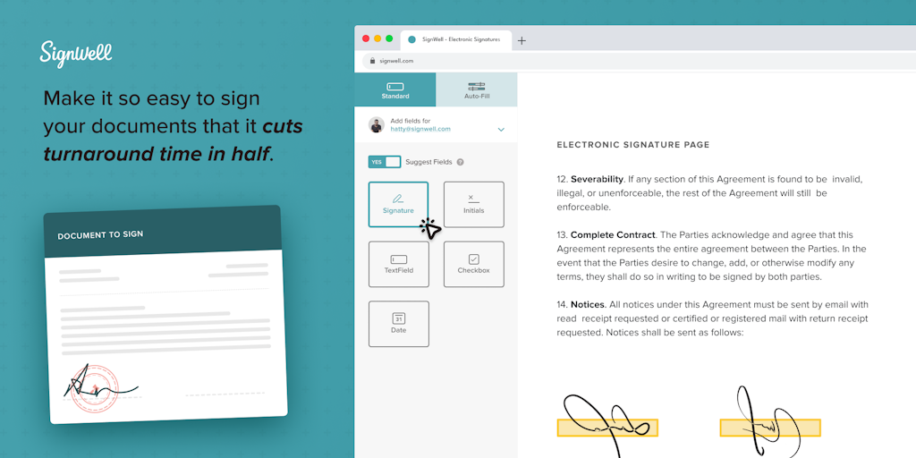 Getting your documents signed should be easy and affordable, without any hassle. Simplify the document signing process and spend less time chasing signatures with SignWell’s legally-binding e-signatur