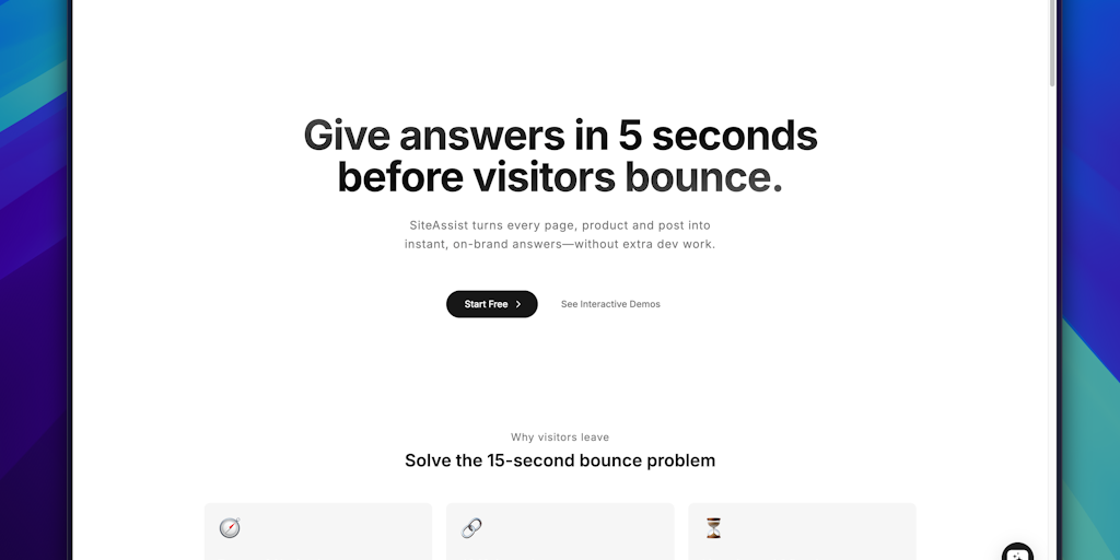 SiteAssist adds a fully brand-able AI assistant to any page—product, docs, dashboards. A lightning crawler indexes your entire site & files in minutes. Free hobby tier; live in 5 min.