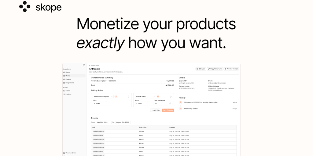 Skope is the billing system for companies selling AI products. It’s the first to natively support outcome-based pricing and supports every standard pricing model (subscriptions, usage, hybrid, etc). N