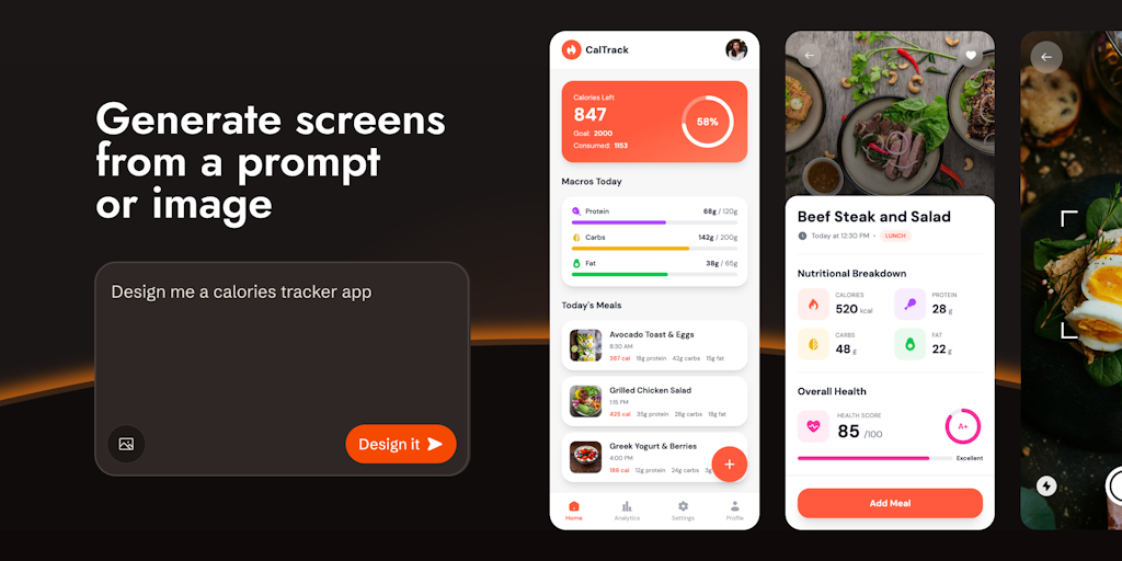 Go from mobile app idea to beautiful screens in minutes. Iterate and refine your designs by chatting. Export to Figma or code.