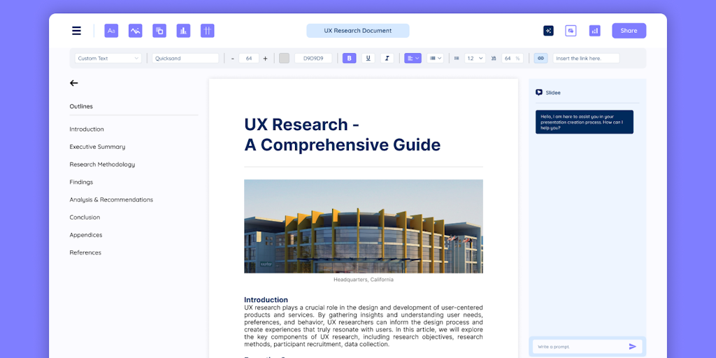 Slideoo is a productivity SaaS tool that allows users to create documents and presentations from text, PDFs, websites, and YouTube URLs in 1 minute with real-time collaboration, giving analytics about