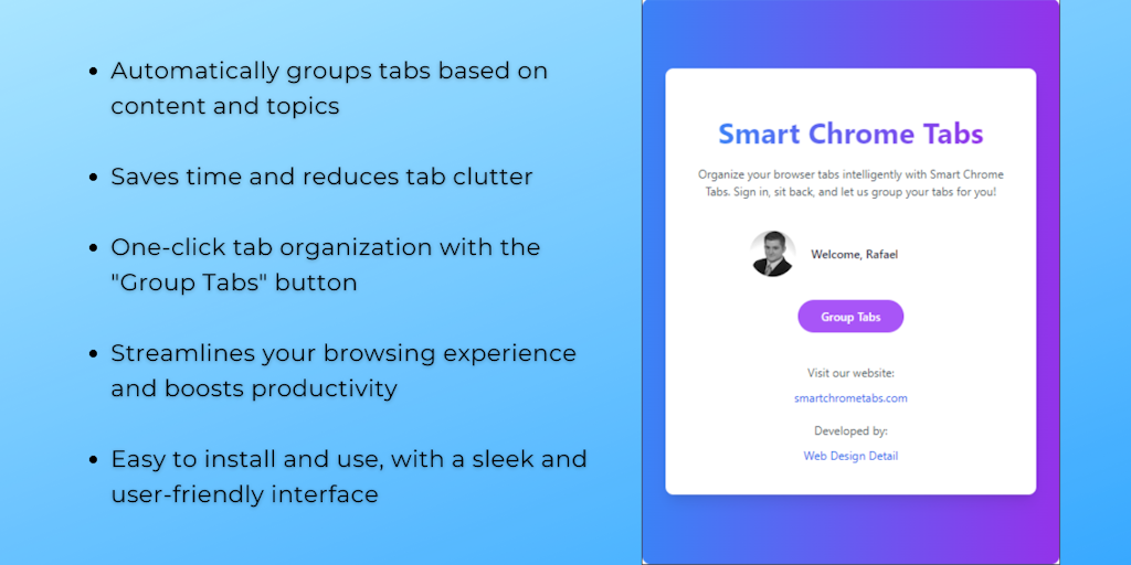Smart Chrome Tabs automatically groups your tabs based on content, helping you stay organized and focused. No more tab overload - navigate through related tabs, boost productivity, streamline your bro