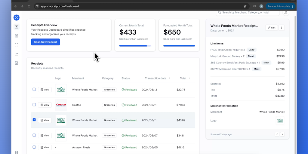 Snapceipt turns your paper receipts into spending insights. Upload your receipts to automatically process receipt data and categorize line items. Understand your purchasing habits, track expenses, and