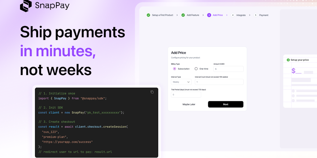 SnapPay is a Stripe-plus billing SDK for founders who want payments without webhooks. Create a checkout in 1 line, get clean SSE events instead of dozens of webhooks, and track credits, seats, or feat