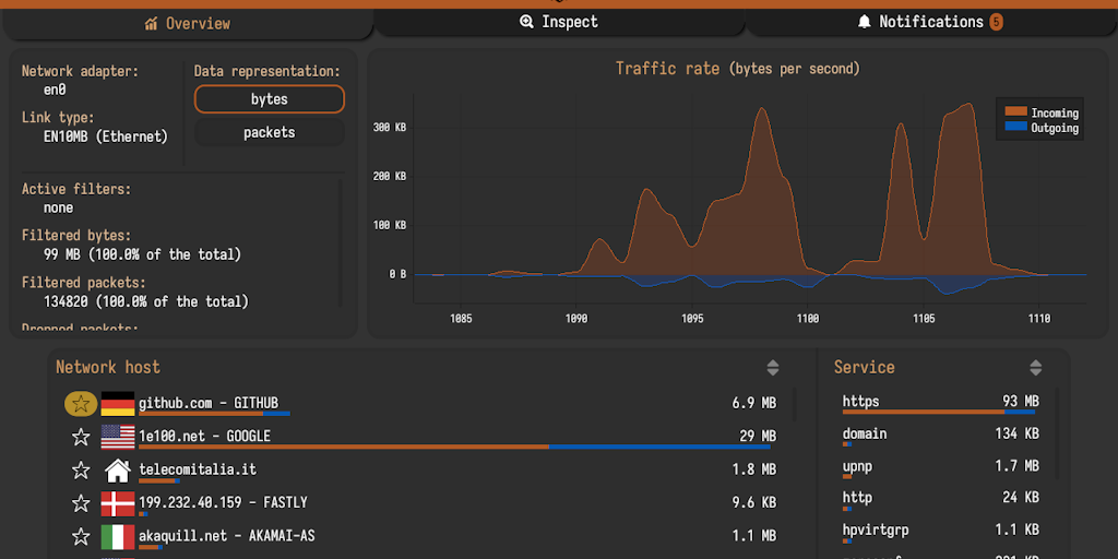 Sniffnet is a network monitoring tool, born to help everyone dive into their Internet traffic with ease. The app is completely free and open-source: all the source code is available on GitHub, where t