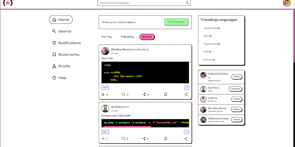 Snipblr is a dev-focused social platform for sharing code snippets. Star, fork, discuss, and collaborate easily. Join us and level up your coding!