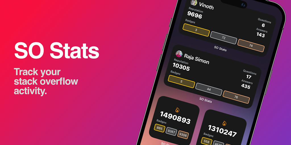 SO Stats is the ultimate companion app for Stack Overflow users! With SO Stats, you can easily track and view your Stack Overflow profile stats, including your reputation, answers, questions, badges,