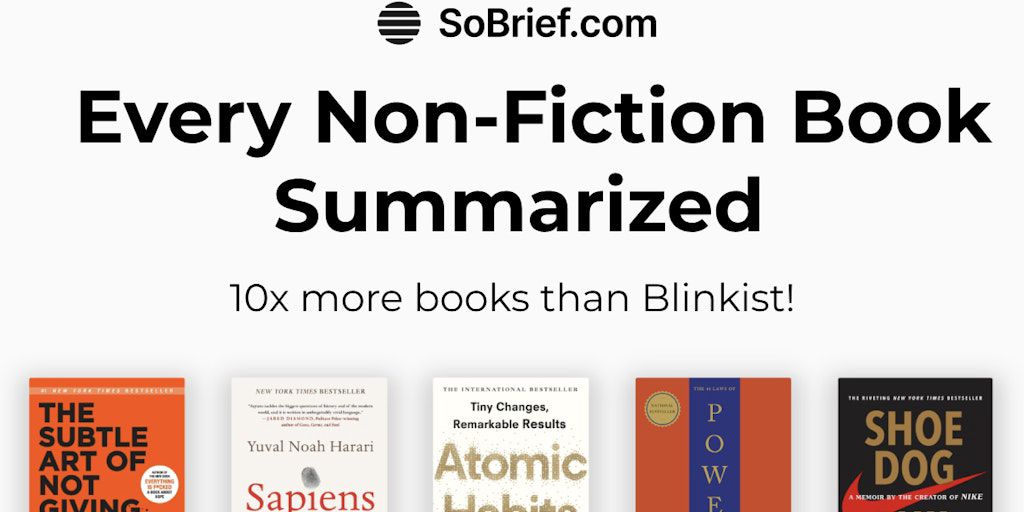 SoBrief is the world's largest book summary platform, containing 73,530+ thorough book summaries with audio narration. AI-powered book curation. Supports 40 languages. 100% free to read. No signup is
