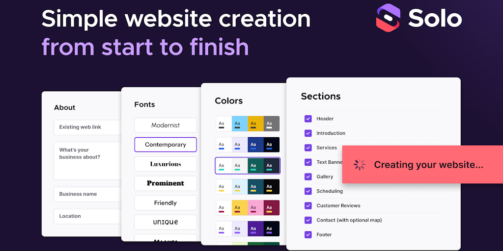 Solo will instantly create a beautiful website so you can grow your business. Solo can use your existing business or social presence (e.g. Yelp, Facebook) to create your new website. Only with Solo, c