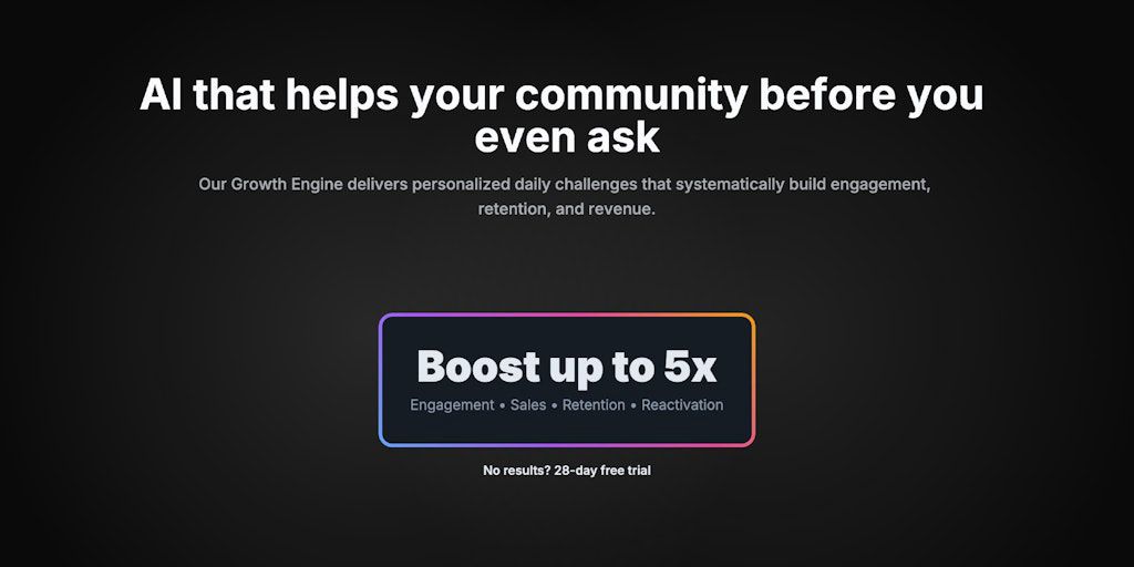 AI Growth Engine that helps before you ask with daily personalized challenges that boost engagement, retention, reactivation and revenue up to 5x. Working on Discord (soon on Slack and Telegram!).