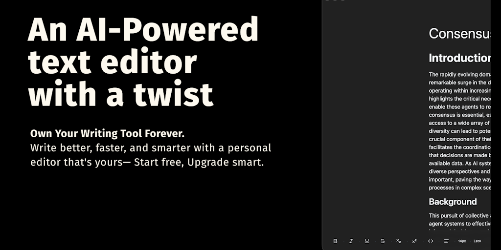 Own Your Writing Tool Forever. Enhance your writing experience with a personal editor that empowers you to write better, faster, and smarter. Begin your journey for free and upgrade wisely to unlock a