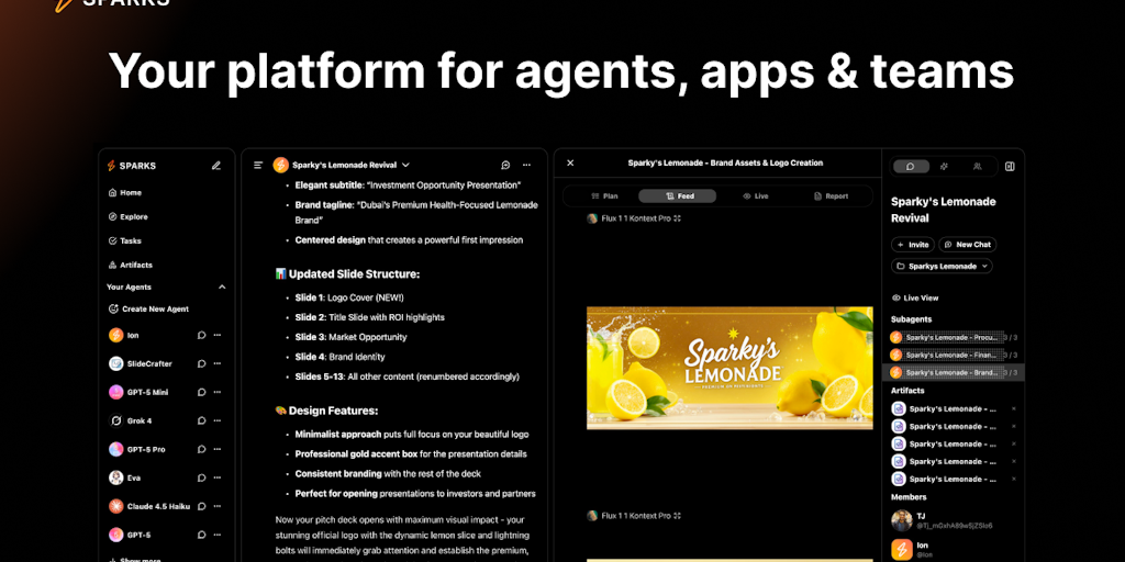 Sparks AI is a platform where you can create custom AI agents with any model (GPT-5, Claude, Gemini). Add tools from our app store, get persistent memory, team collaboration, and agent teams that spaw