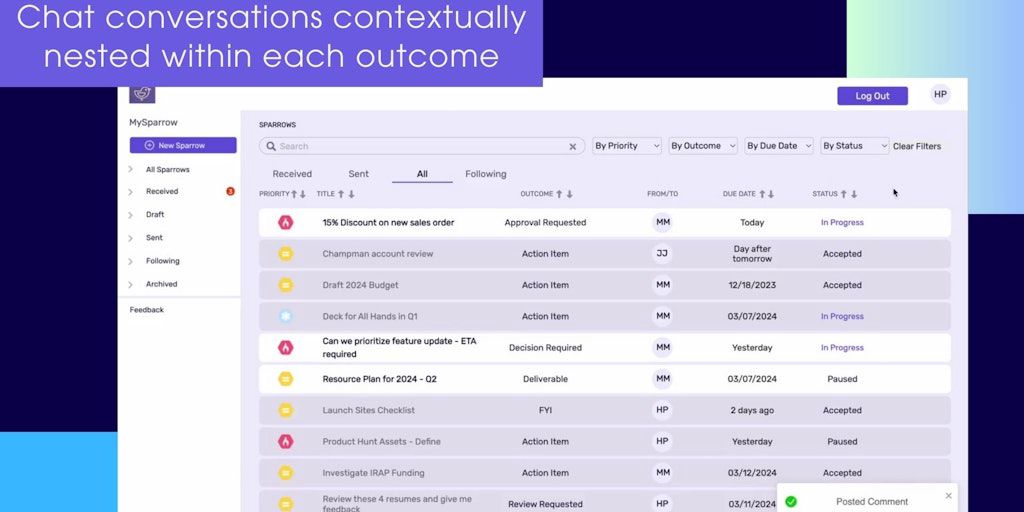 Sparrow is an outcome-driven communication tool that helps cross-functional teams collaborate with purpose, increase transparency, and build accountability. An outcome can be a decision, action item,