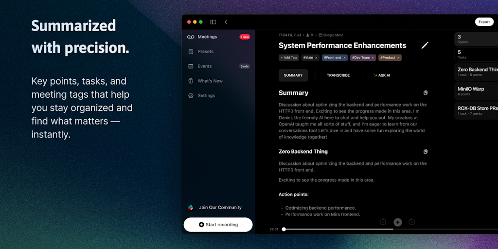 Spellar AI is AI-powered Meeting Assistant for MacOS and iOS Spellar boosts productivity and language proficiency for online meetings. It provides real-time tips, generates tasks, summaries, and offe