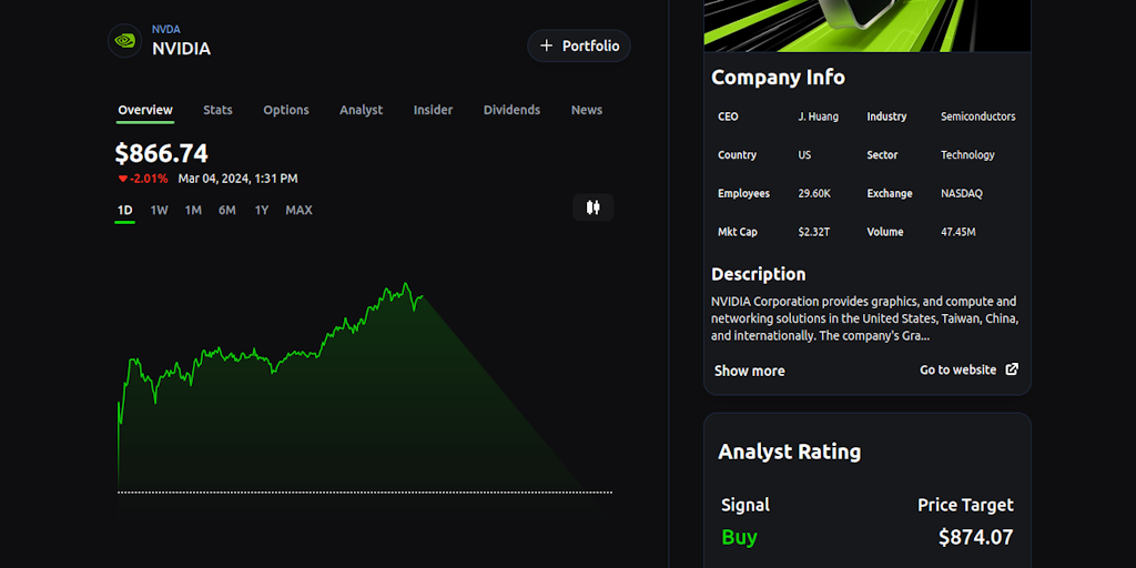 Analyze 10000+ companies, exploring stock prices, options contracts, news, price predictions, charts, memes and more - all in one place!