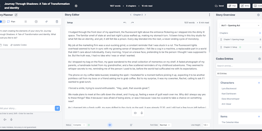 Turn your ideas into novels fast with StoryLegend. Our AI-powered writing dashboard helps you craft engaging narratives, develop and chat with your characters, and structure your plot. Save time and p