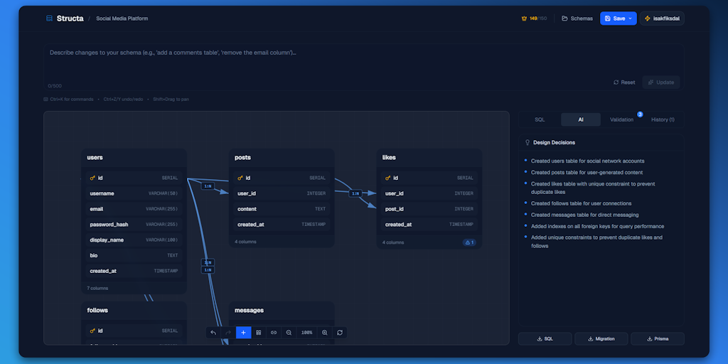 Turn natural language into production-ready database schemas with visual ER diagrams. Unlike ChatGPT, Structa lets you edit with clicks, catches errors with validation warnings, and exports to SQL, Pr