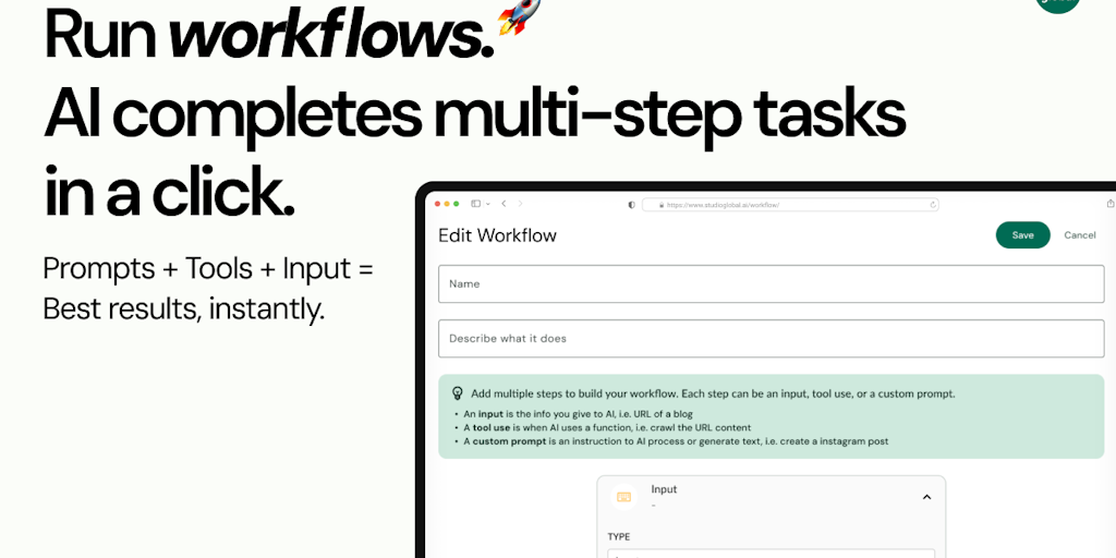 Studio Global - Imagine Zapier met AI Agents for workflows to automate tasks | Product Hunt