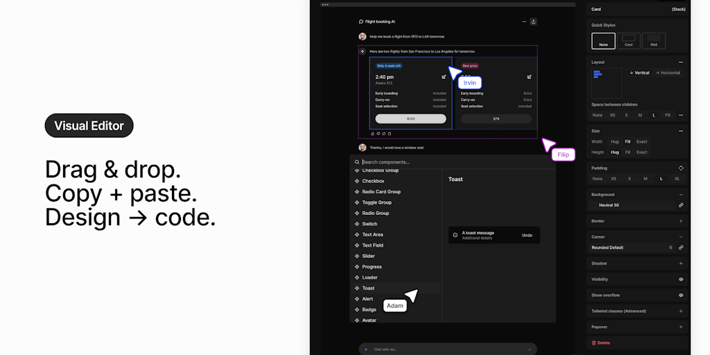Visually build UI using real components. Start with stunning templates. Personalize your theme. Design pages with our intuitive drag-and-drop editor. Then, save hours by never having to write CSS agai