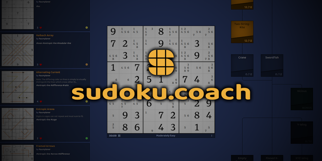sudoku.coach is THE website for all of your Sudoku needs. Here you can solve Sudokus, learn new techniques, practice those, print out Sudokus on paper and much more.