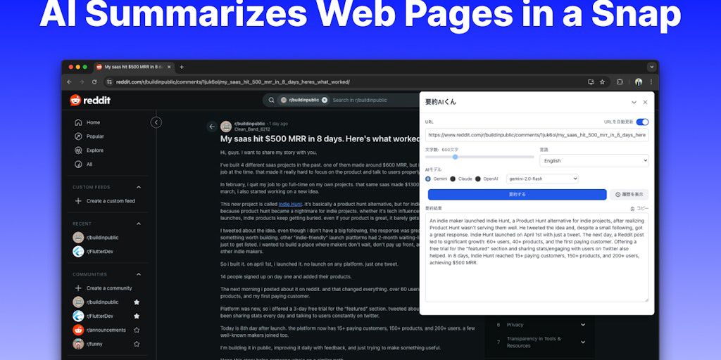 Instantly condense any webpage to your chosen length. Pick Gemini, Claude or OpenAI models; output in English or Japanese and translate across languages. Auto‑detect URL, one‑click copy/share, keep/ex