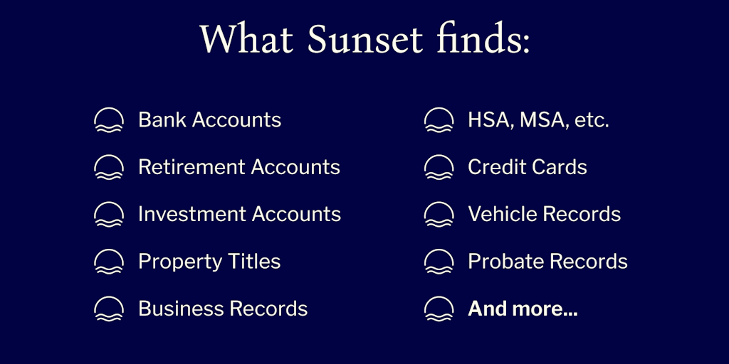 Use Sunset to find and close financial accounts after a death: Bank accounts, 401k, IRA, Life Insurance, Credit Cards, real estate, and more.