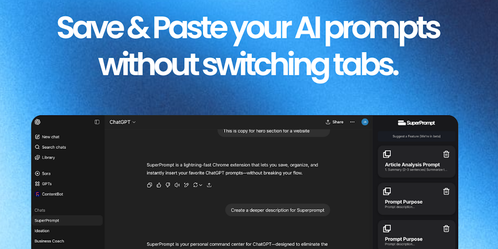 Tired of rewriting the same AI prompts or digging through old docs to find them? SuperPrompt is a simple Chrome sidebar that saves your favorite prompts and lets you paste them instantly into any chat