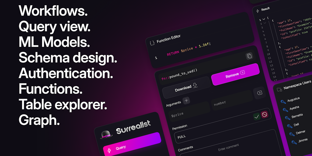 Surrealist lets you visualise SurrealDB queries as interactive knowledge graphs. Instantly spot patterns, explore relationships, and bring your data to life with real-time insights powered by graphs,