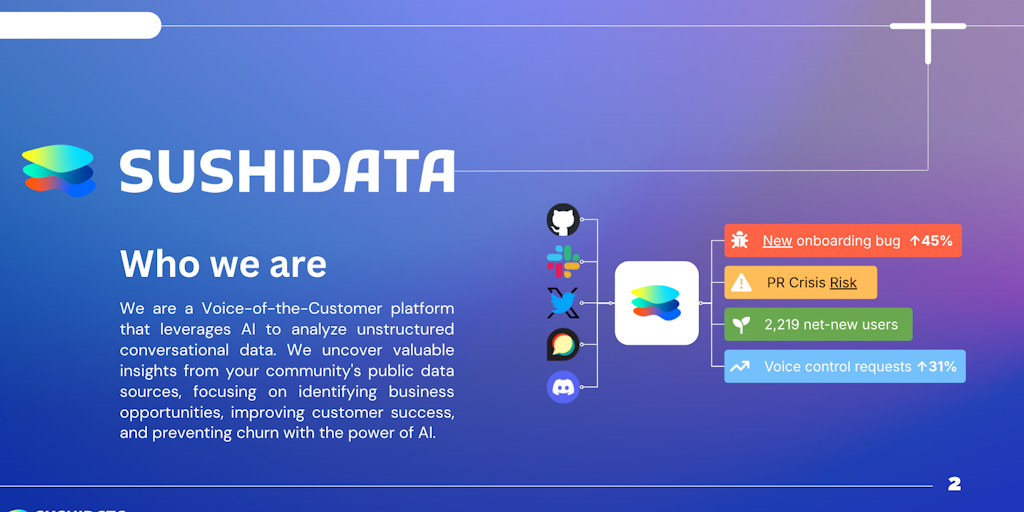 We are a Voice-of-the-Customer platform that leverages AI to analyze unstructured conversational data. We uncover valuable insights from your community's public data sources, focusing on identifying b