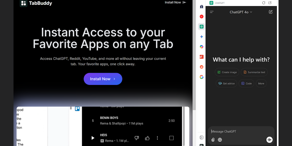 TabBuddy lets you open any app in a convenient sidebar, customize your app list, and stay productive without switching tabs. Perfect for multitaskers who want seamless access to tools and services whi