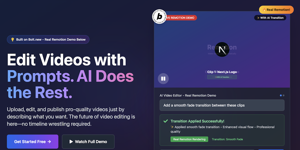 Stop spending hours editing videos. Upload raw footage, describe what you want in plain English, and get professional videos with cuts, transitions & effects automatically. AI understands your content