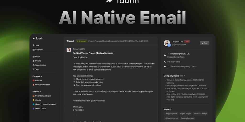 Simplify your email experience with Taurin. This tool streamlines your inbox by organizing messages, providing summaries, and (enriches contacts). Taurin’s smart features help you spend less time mana