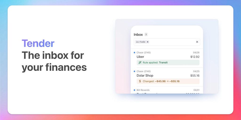 Tender is a new kind of personal finance tool centered around an inbox-zero workflow. With Tender you can review spending at your own pace without worrying that something might slip through the cracks