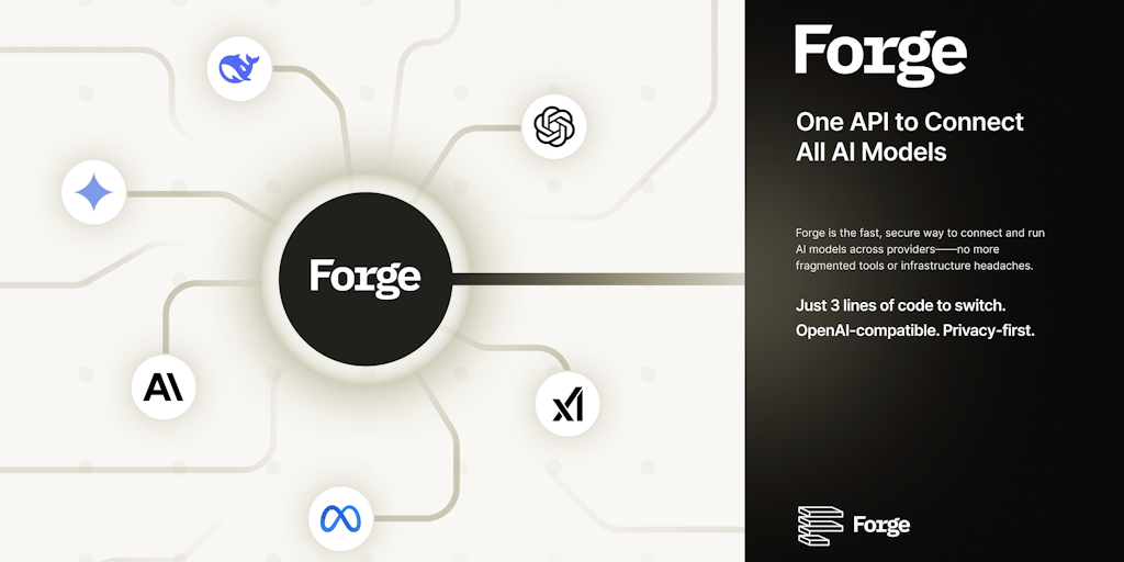Forge is the fast, secure way to connect and run AI models across providers—no more fragmented tools or infrastructure headaches. Just 3 lines of code to switch. OpenAI-compatible. Privacy-first.