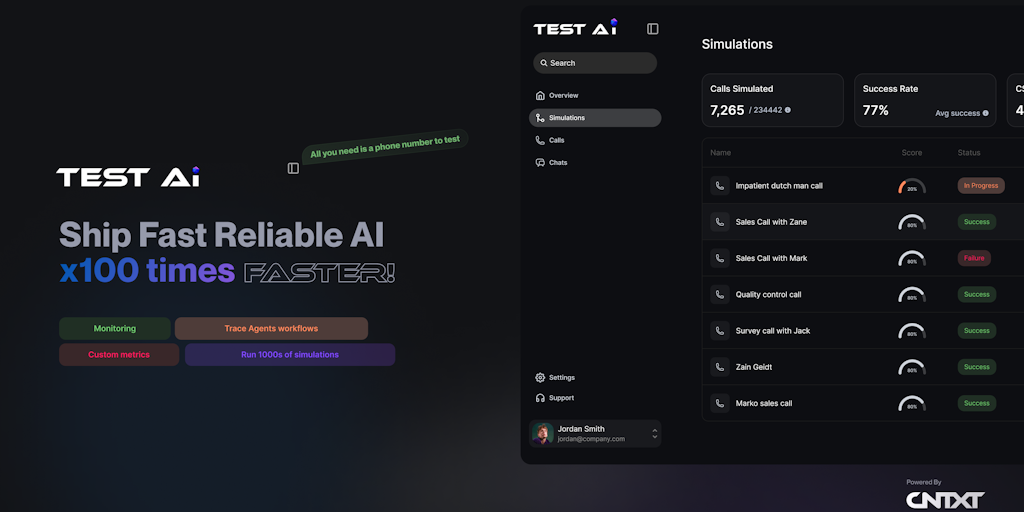 Because AI Should Just Work : Real-world simulation & evaluation for voice & chat agents. Automated testing, call analytics, and trust & safety reporting ensure flawless performance.