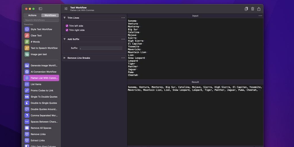 An iPhone and Mac app that can be used to manipulate and transform text. No matter what text you’re working with, Text Workflow can save time and frustration whether want to make the same small change