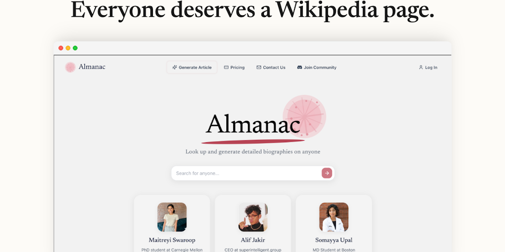 Almanac lets you type any name and instantly see a professional, public-facing profile for that person. Search yourself or anyone else, if the profile does not exist yet, you can generate it in <10s.