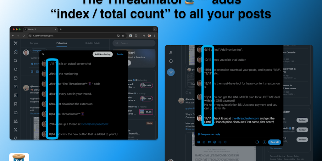 The Threadinator™ for 𝕏 - Add numbering to threads on 𝕏 | Product Hunt