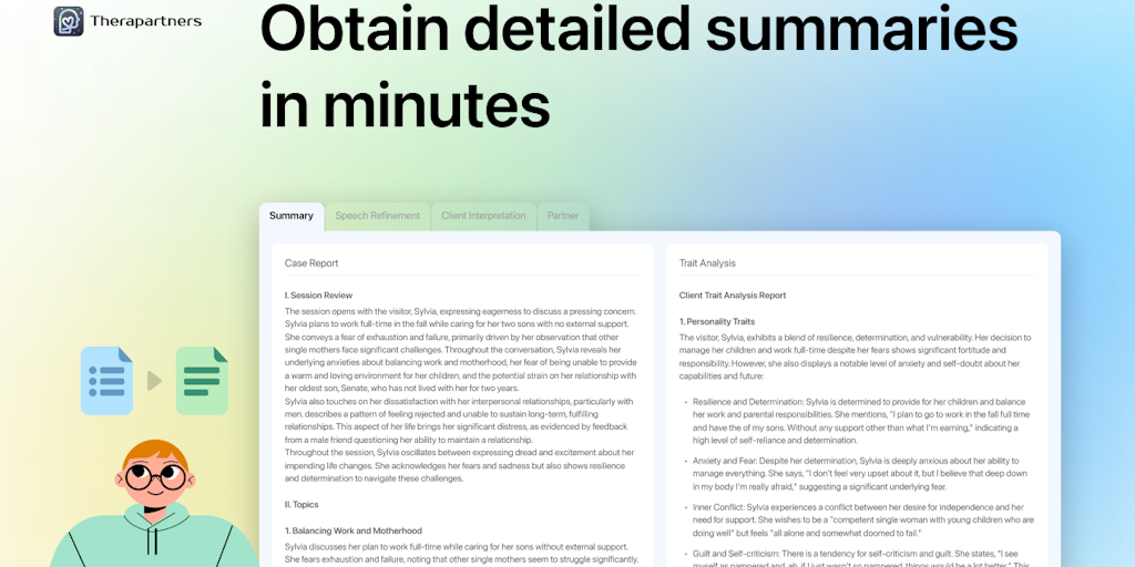 Therapartners is a platform designed for therapists. Powered by AI, it helps therapists efficiently manage cases, conduct in-depth case analyses, and enhance overall therapeutic competence.