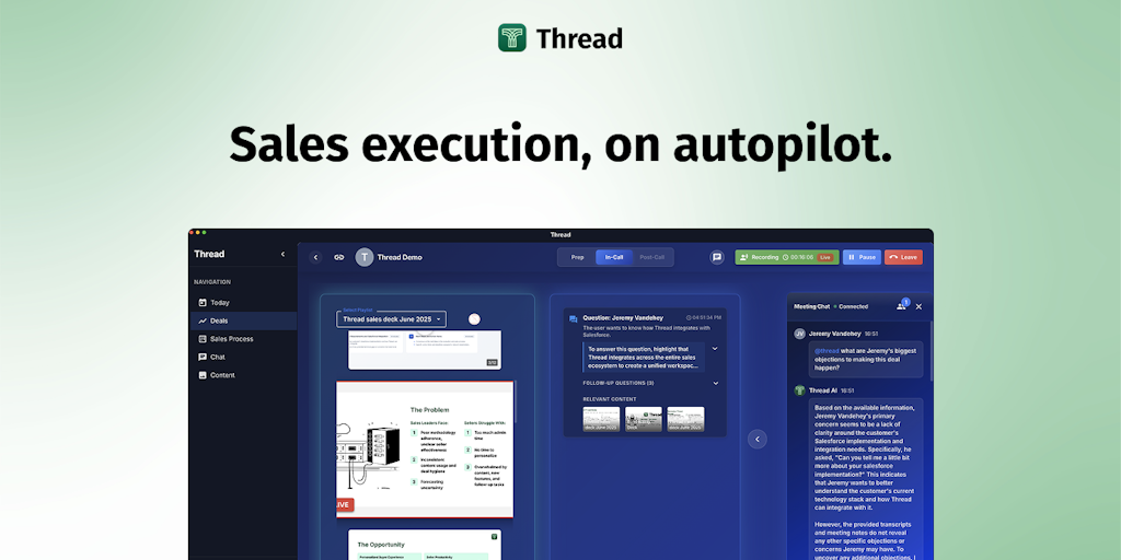 Thread is your single pane of glass to close more deals, faster. Prep, personalize, and follow up in seconds, so you spend more time with prospects, less on admin. Sellers save ~4 hrs/week to do more