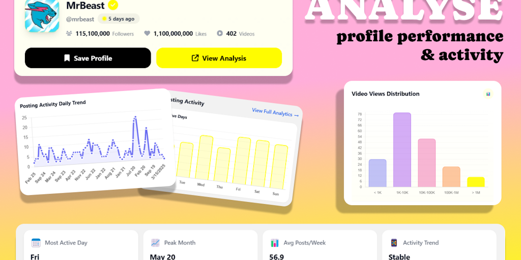The most comprehensive TikTok profile analysis tool. Get deep insights, download videos, analyze hashtags, and access sounds. Perfect for creators and marketers.