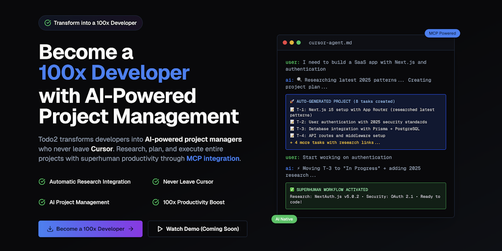 Become a 100x Developer with AI-Powered Project Management Todo2 transforms developers into AI-powered project managers who never leave Cursor. Research, plan, and execute entire projects with superhu