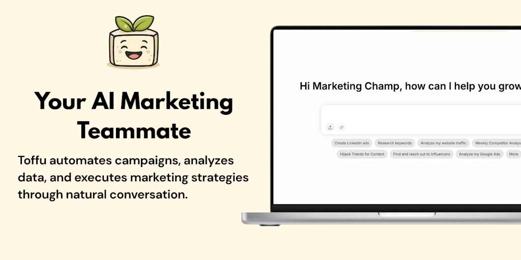 Toffu is your AI marketing teammate that helps you execute marketing strategies, analyze data, and make data-driven decisions - all in a simple chat.