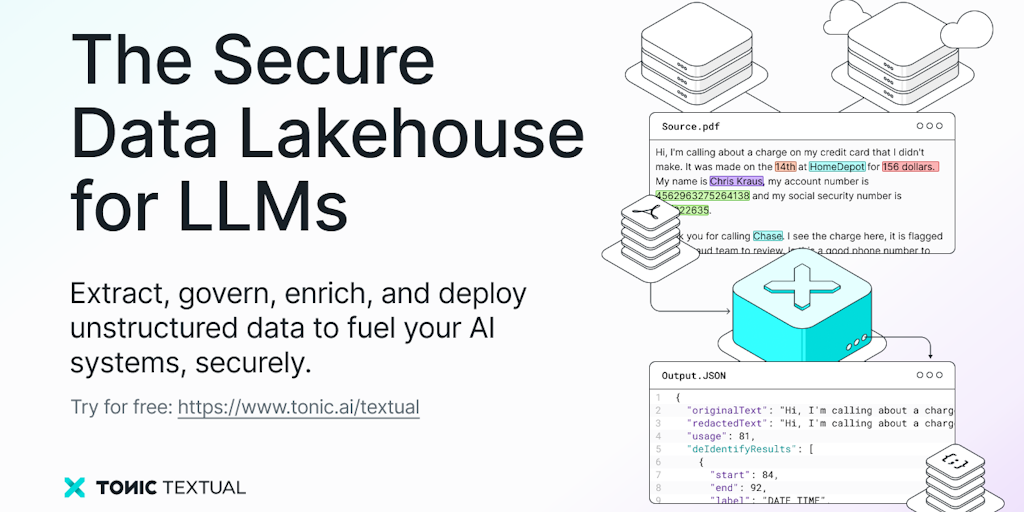 Tonic Textual is the world’s first secure data lakehouse for LLMs, seamlessly unifying, protecting, and preparing your unstructured data for generative AI. With Textual, you can extract, govern, enric