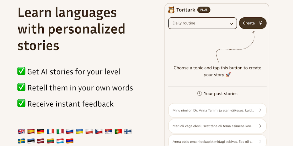 Tired of flashcards? Toritark generates personalized stories for your language level. Read the story, take a quiz, then retell it. The app analyzes your retelling and gives instant, detailed feedback