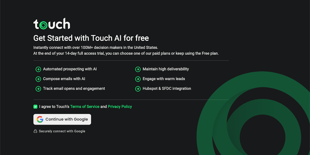 Touch AI helps salespeople close more deals by curating targeted leads from our 100M+ verified US business contacts. Using Bayesian models for high conversion probability, Touch AI crafts and sends pe