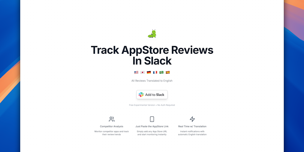 Real time tracking of AppStore reviews across 7+ countries in Slack translated to English. Just 3 steps to install: 1. Enter AppStore URL of ANY application, 2. Select the countries, 3. Select Slack c
