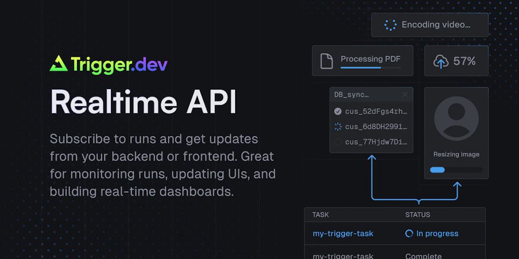 Realtime keeps your users updated with live progress from your background tasks. Show progress bars, AI/LMM streaming responses, and AI agent observability. Use the Realtime API for live updates and R